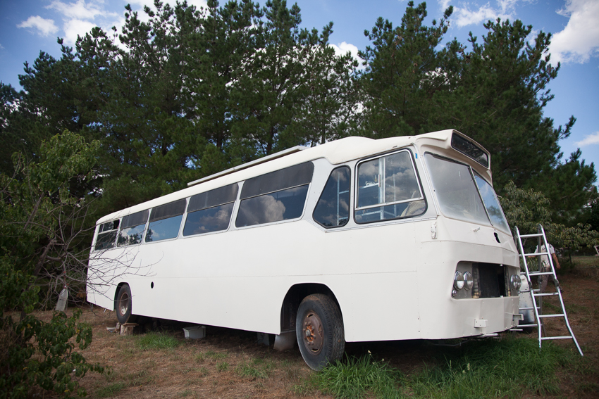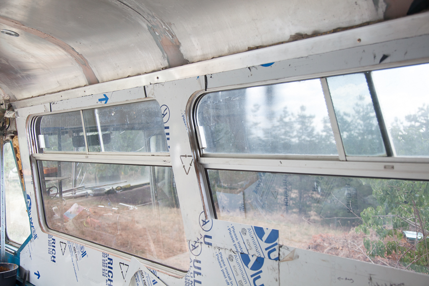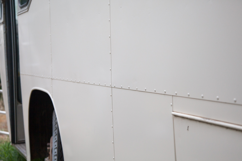 We stripped the apricot paint off the outside and the roof, painted the roof with a thermoshield paint for insulation (insulation has been a big consideration all round on this bus!) and matched the rest of the exterior with a similar colour. You can see the edges of our four solar panels on the front half of the roof….here are a couple of before pictures.