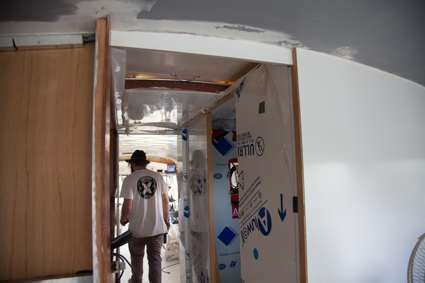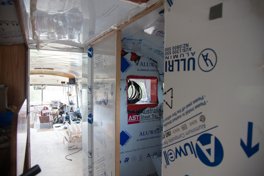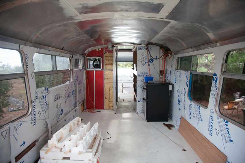 This front area is still totally unfurnished. Still, there has been a lot done here. We stripped the interior, took off the old wall panels, pulled up the floor which has now been sanded and painted three times. Then we insulated (after removing old, itchy pink batts) and installed power cables under the roof panels. The walls are now clad with ‘Aluwell’ which is aluminium bonded to plastic, making it fairly flexible and also extremely durable. They are matt white walls, it’s hard to see it now in all it’s glory, but the walls are waiting to be unveiled under the plastic. We’ve kept as much window space as possible, but have had to build the walls up part of the way to make room for our kitchen benchtops. The red area at the back will become our pantry cupboard and also space for a water heater and plumbing into the shower. All the walls you see were put in ourselves.