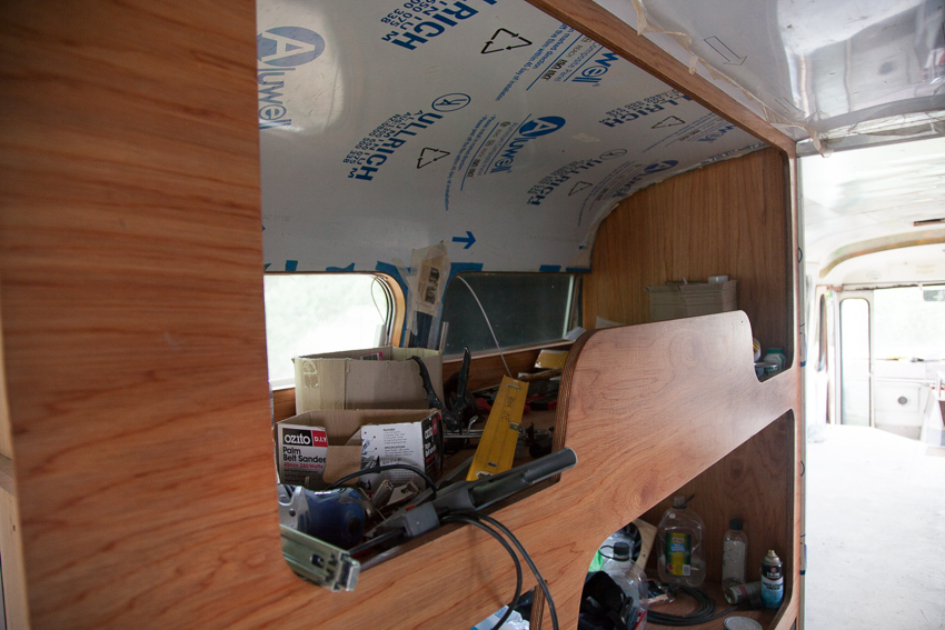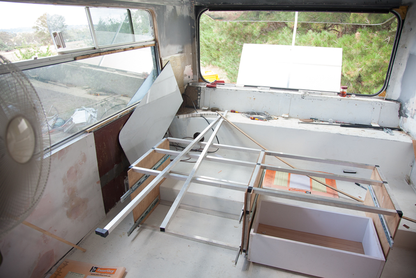 This is our bedroom. Another thing which looks minor, but was major, is that back opening window. Initially this window was fixed, but we realised that in such a small space there really needed to be a way for the breeze to come through and so Henry designed and made this window you see here, using the same panel of glass but building the sill so that it was waterproof and also fit the newly clad window. These small things take the longest of time, but will be so necessary for when we are actually living in the thing. Not if…when! Also, you can’t see the ceiling here, but Henry took a very, very long time, panelling, bogging and sanding the ceiling so that it is actually seamless and ultra smooth. Many bus-homes keep the rivets or attach lights to the roof, but we wanted a seamless, vast feeling roof, as in actual fact it is really quite low.